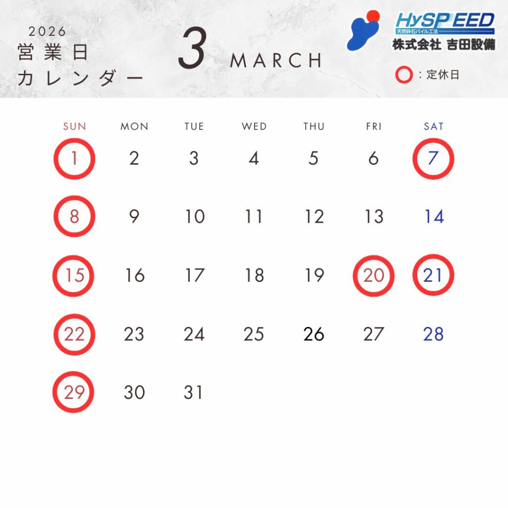なお、赤丸が付いている日付けが基本定休日となっておりますが、
