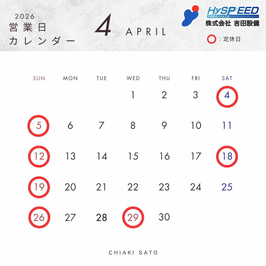 なお、赤丸が付いている日付けが基本定休日となっておりますが、